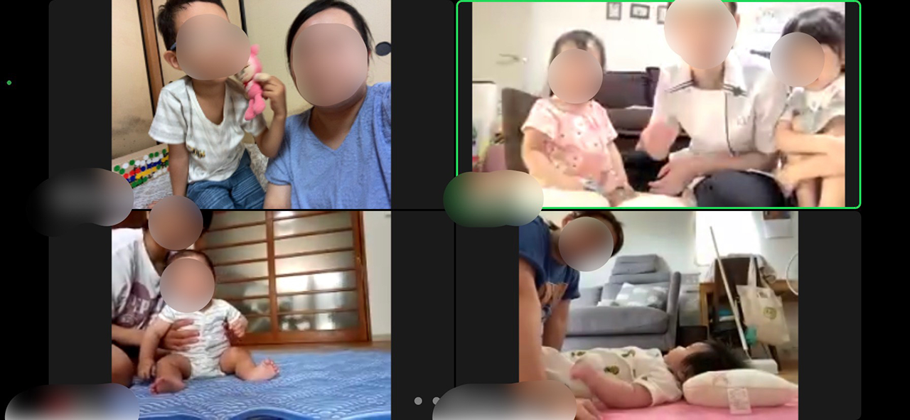 マッサージは本来はオイルを使用して直接肌に触れながら行うのですが、今回はオンライン開催ということでオイルを配ることができないため、肌着などの上からでもできるものを行いました。 お腹や胸などから手足の指先まで、お子さんの身体の色々な部分に触れながらマッサージ。親子で顔を見合わせながら、皆さん笑顔でマッサージの時間を楽しんでいただけていたように見えて、こちらも嬉しい気持ちになりました。
