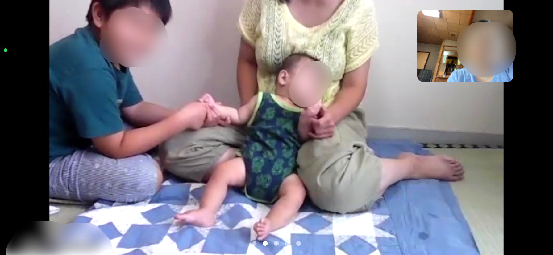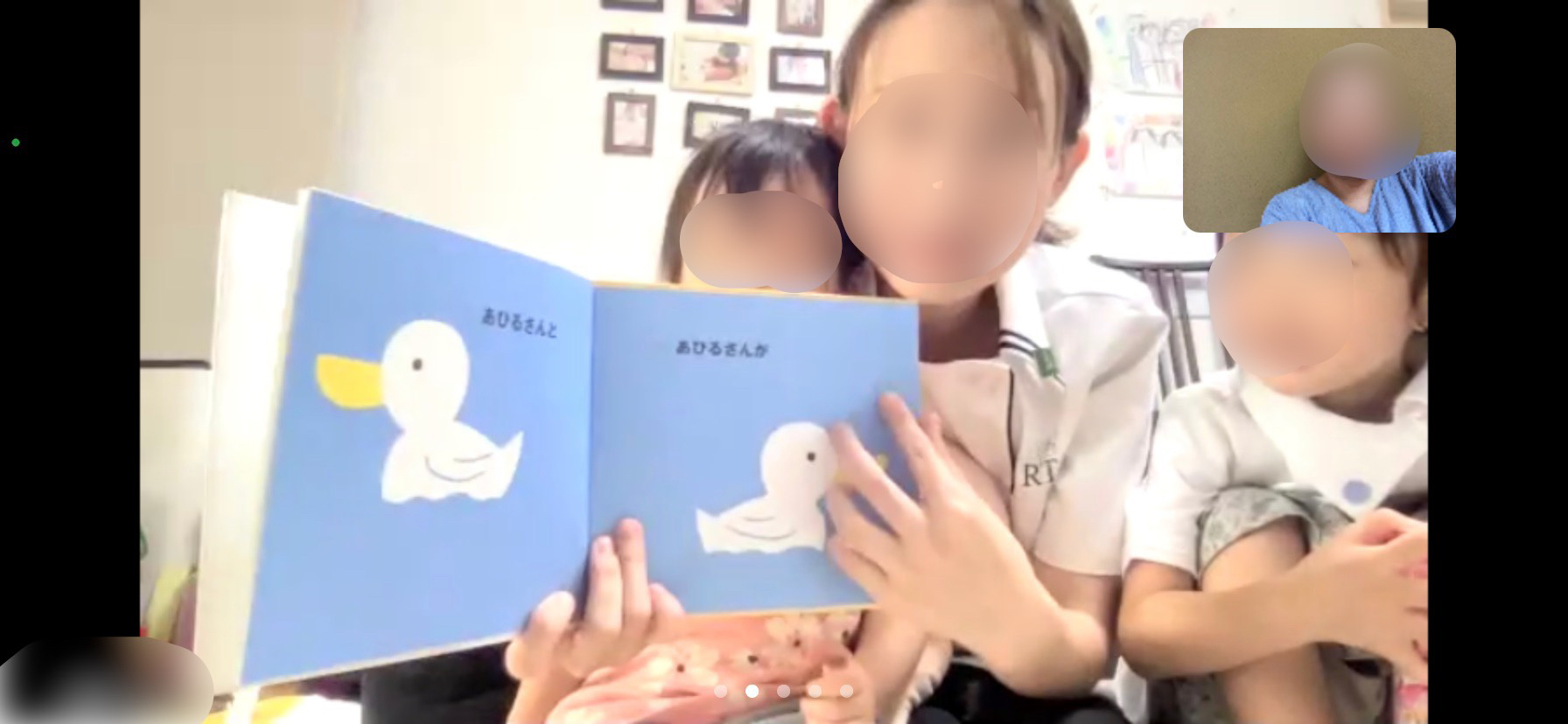 最後は絵本「くっついた」の読み聞かせ。おはなしに合わせて、参加されている方がそれぞれに親子やきょうだいで顔をくっつけてほほえみ合う姿がとても素敵でした。 今回参加してくださった方は0歳児のお子さんも多く、途中でお腹が空くお子さんや眠くなるお子さんもいましたが、オンライン開催だったので、いつもの安心できるお家でそれぞれのペースで無理なく参加していただけたのが良かったと感じました。