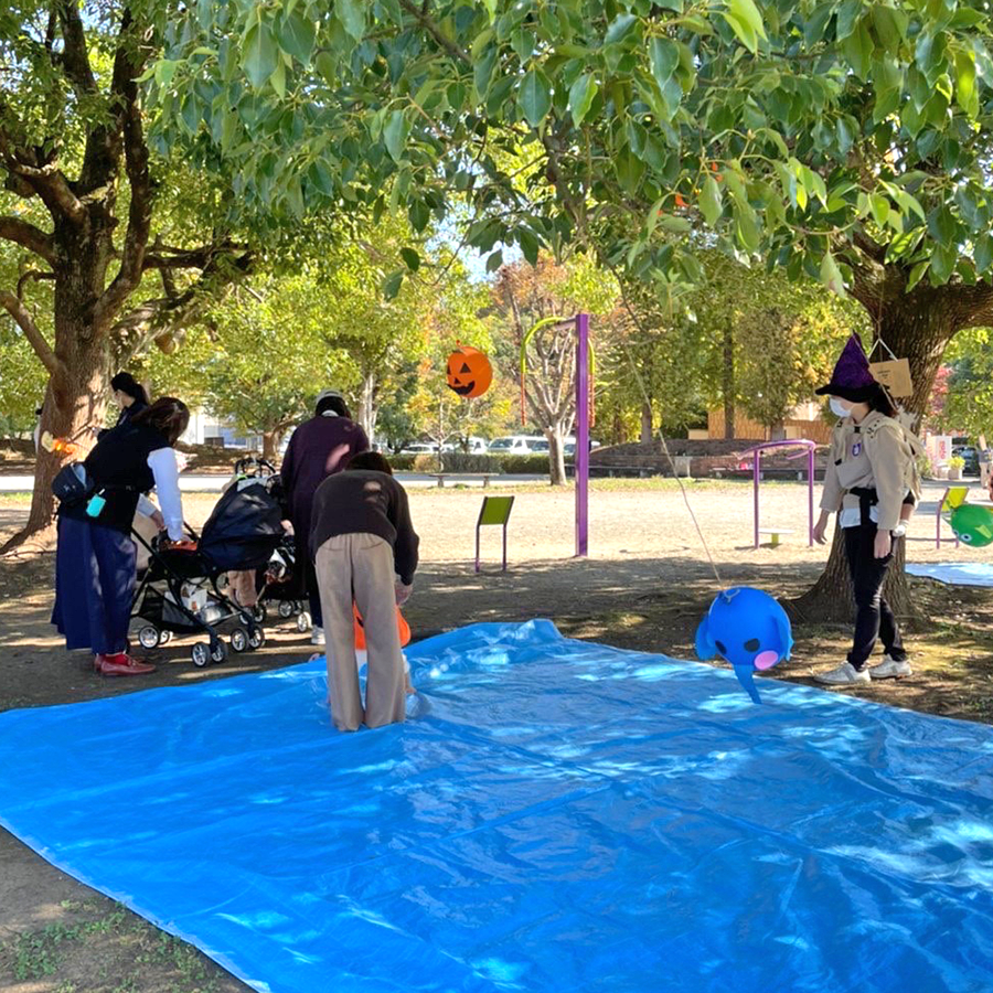 お菓子狩りゲームとボール入れゲームは、身体を動かしたいお子さま方の笑顔がたくさん見られました。工作コーナーでは、みんなで子育てについてのおしゃべりなどをしながら、ハロウィンバッグを作りました。ママさん達が工作中、お子さん達は、おもちゃで楽しく遊びました。