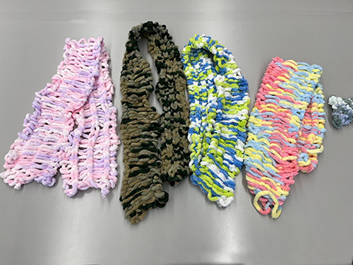 大きいテーブルを皆で囲み、それぞれすきな毛糸を選んで指編みマフラースタート!